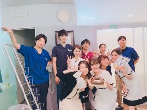 院長からのバースデーケーキとスタッフからのプレゼントでお祝いをし、記念に写真を撮りました。